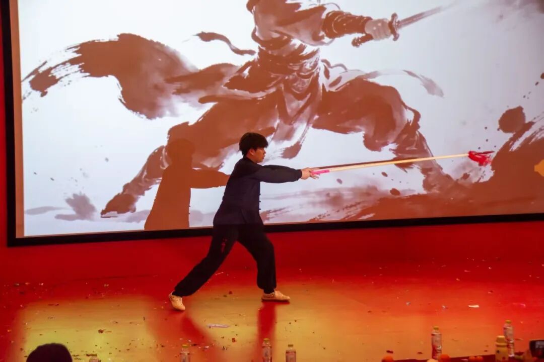 凤凰数媒创意学院的王希宇带来武术表演《舞剑》,剑影翩跹,身法灵动,每一个招式都刚劲有力,尽显中华武术的魅力,台下观众连连叫好。