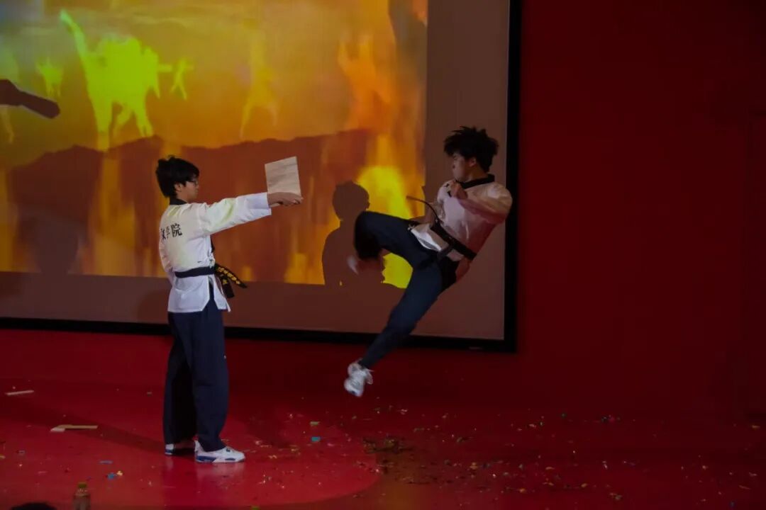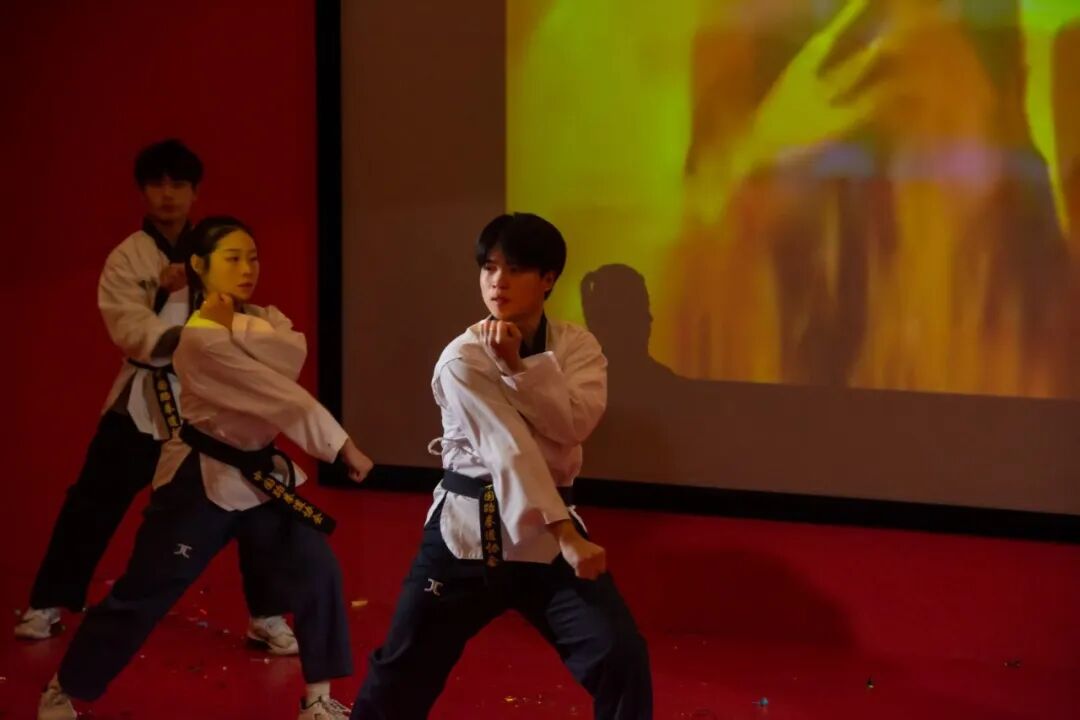 医养健康学院的姜宇轩、赵彦诚等同学带来的跆拳道表演,堪称晚会的“燃点时刻”。出拳刚劲有力,踢腿干脆利落,腾空、格挡、击破等动作行云流水,每一次发力都伴随着阵阵喝彩,尽显武道的阳刚之美。